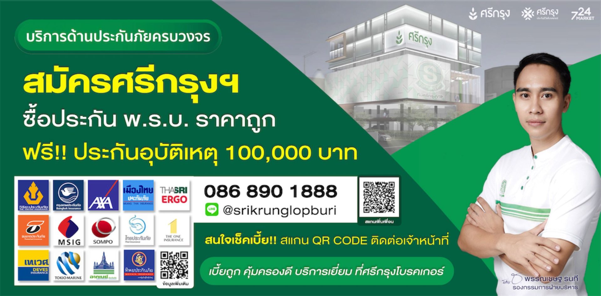 ผมจึงขอเรียนเชิญทุกท่านมาใช้บริการ และท่านใดที่สนใจอาชีพนายหน้าประกันวินาศภัย กับศรีกรุงโบรคเกอร์ เข้ามาศึกษาเรียนรู้ได้ครับ ผมแนะนำให้ครับ
